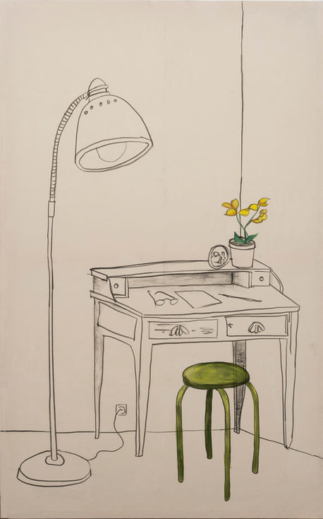 "Wie viele Räume hat der Plan deines Bauchs", Polyptychon bestehen aus acht Leinwänden und einer Bodenfläche, von innen bemalt von außen beschrieben, Acry und Kreide auf Leinwand, 2021, Ausstellungsansicht Kunstverein Augsburg
