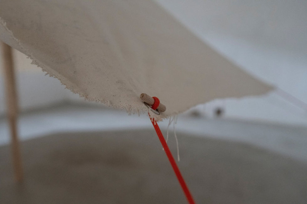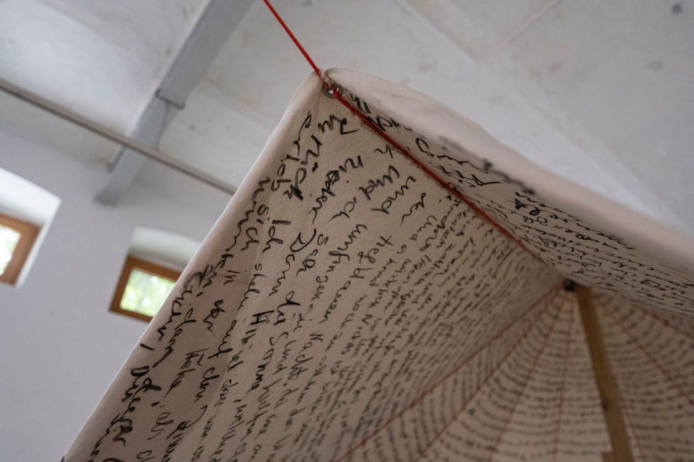 „Kubus der Konzentration“, Polpytychon bestehen aus sechs Leinwänden, 300×300×300 cm, von innen bemalt von außen beschrieben, Acryl, Fassadenfarbe und Kreide auf Leinwand, 2020, Ausstellungsansicht Spinnerei Leipzig