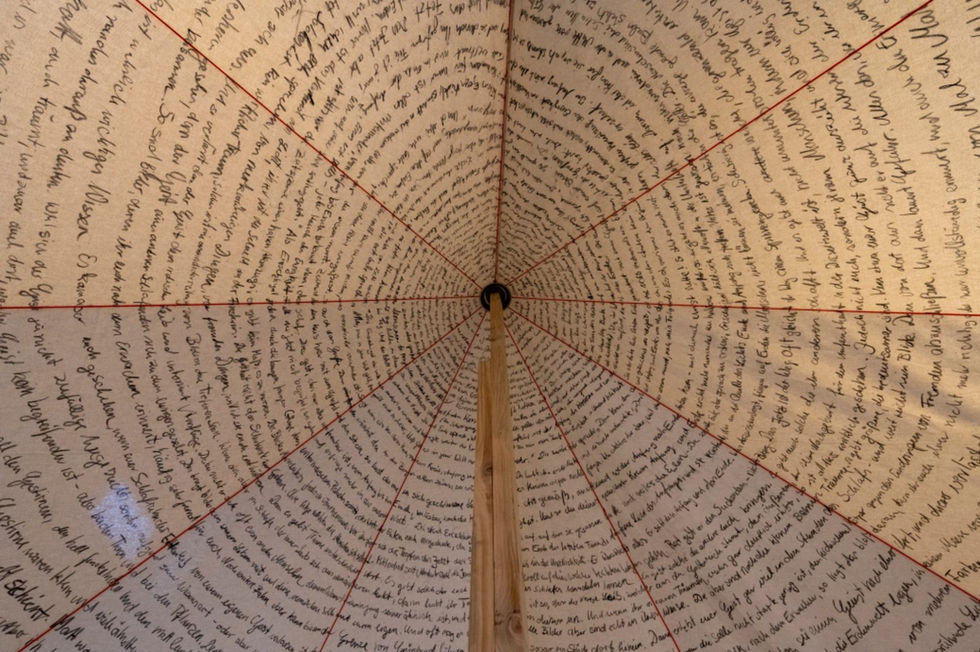 "Zu Besuch im Raum der Zwischenmenschlichen Illusion", Polyptychon bestehen aus elf Leinwänden, von innen bemalt von außen beschrieben, Acryl, Fassadenfarbe und Kreide auf Leinwand, 2020, Ausstellungsansicht Kunstarkaden München